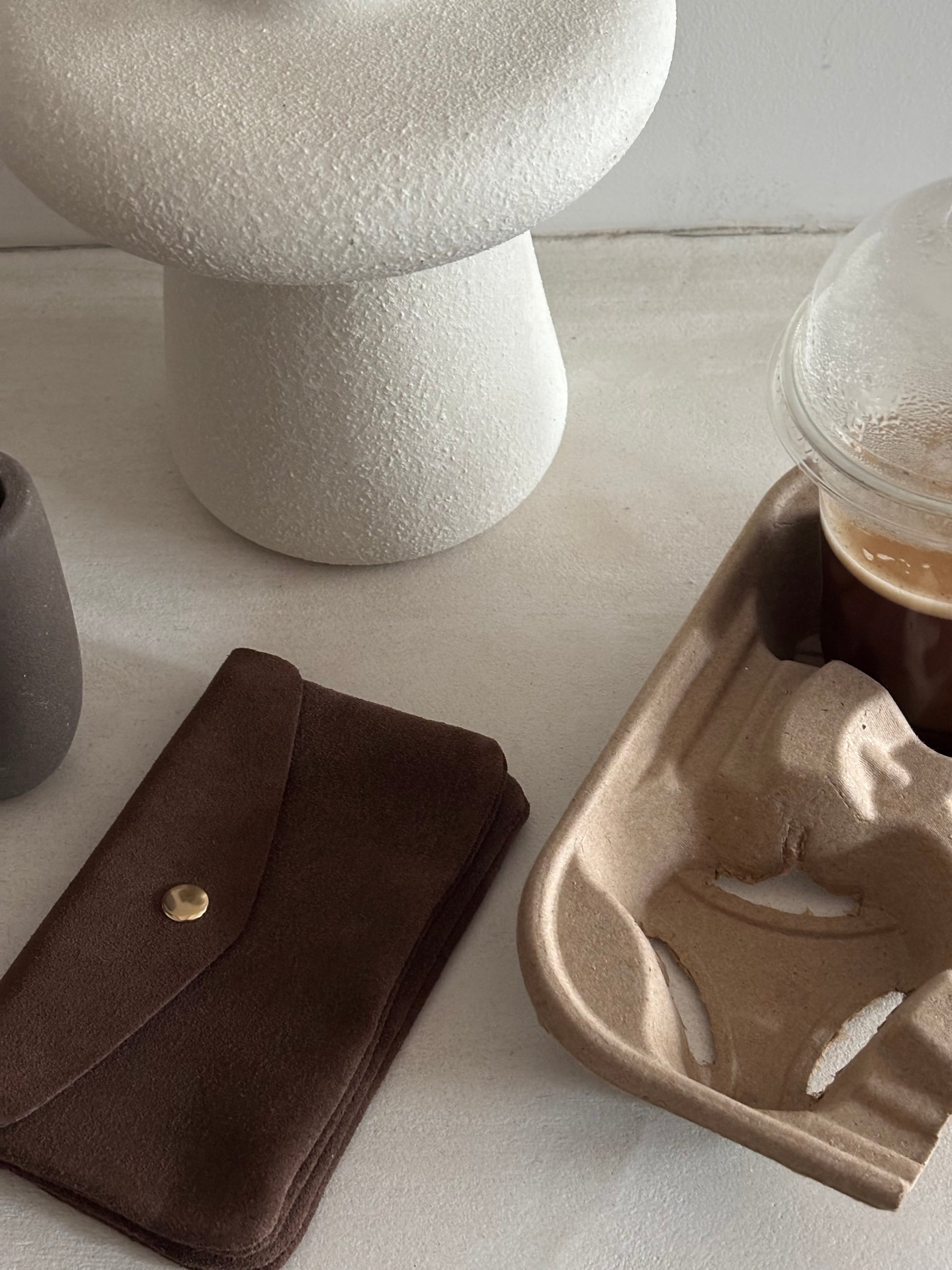 Description : pochette en daim couleur chocolat au lait, doté de trois compartiments. Idéale pour organiser vos essentiels au quotidien.