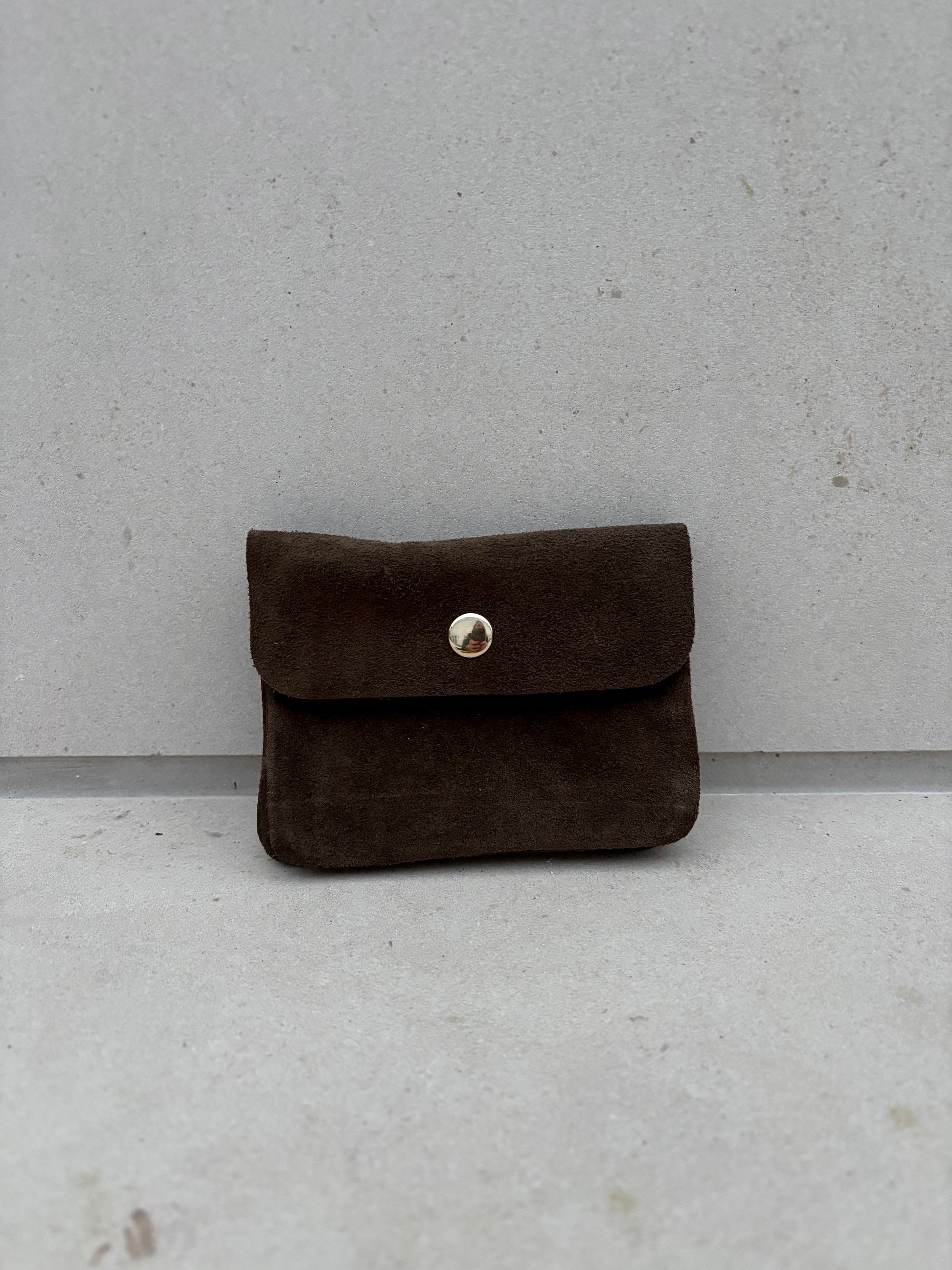 Description : porte-monnaie en cuir brun foncé, doté de trois compartiments : un pour les cartes, un pour les billets, et un avec fermeture à tirette pour les pièces. Idéal pour organiser vos essentiels au quotidien.